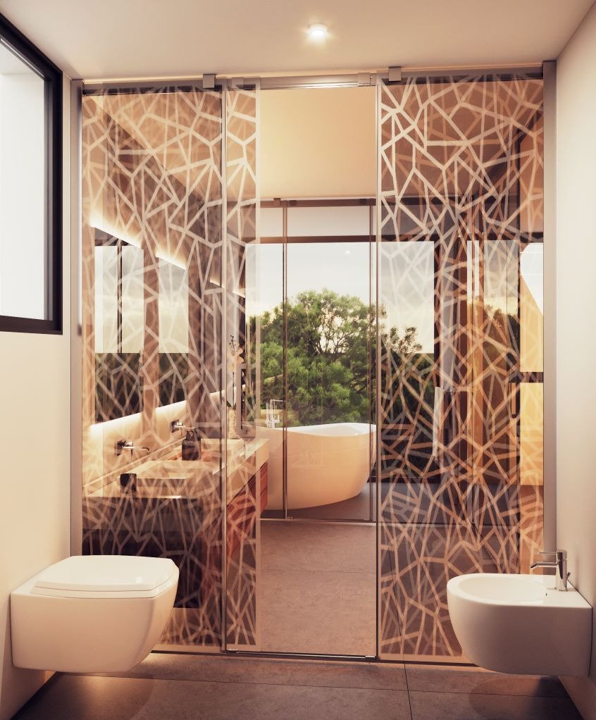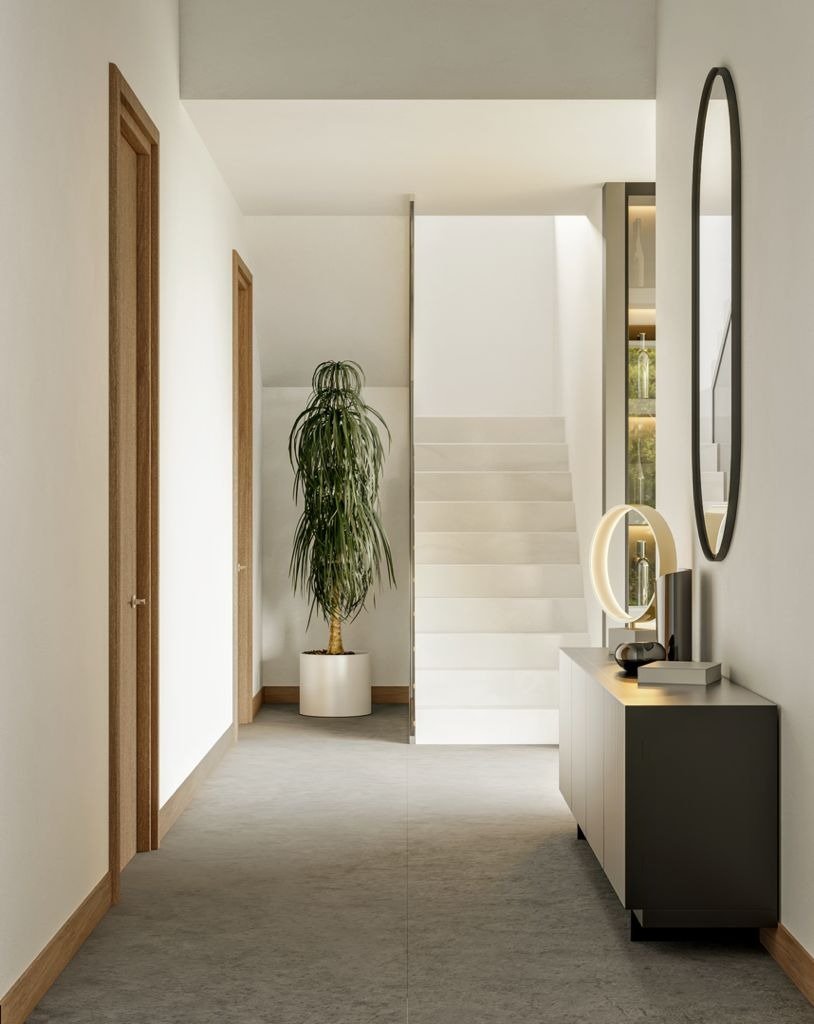 De verdeling van de ruimtes is georganiseerd rond het terras en het zwembad, die fungeren als het ware hart van het huis.Het heeft een zeer functionele verdeling van de kamers met een grote gemeenschappelijke ruimte en drie grote slaapkamers die een eigen badkamer hebben, en een uitzonderlijke kleedkamer in de hoofdkamer.