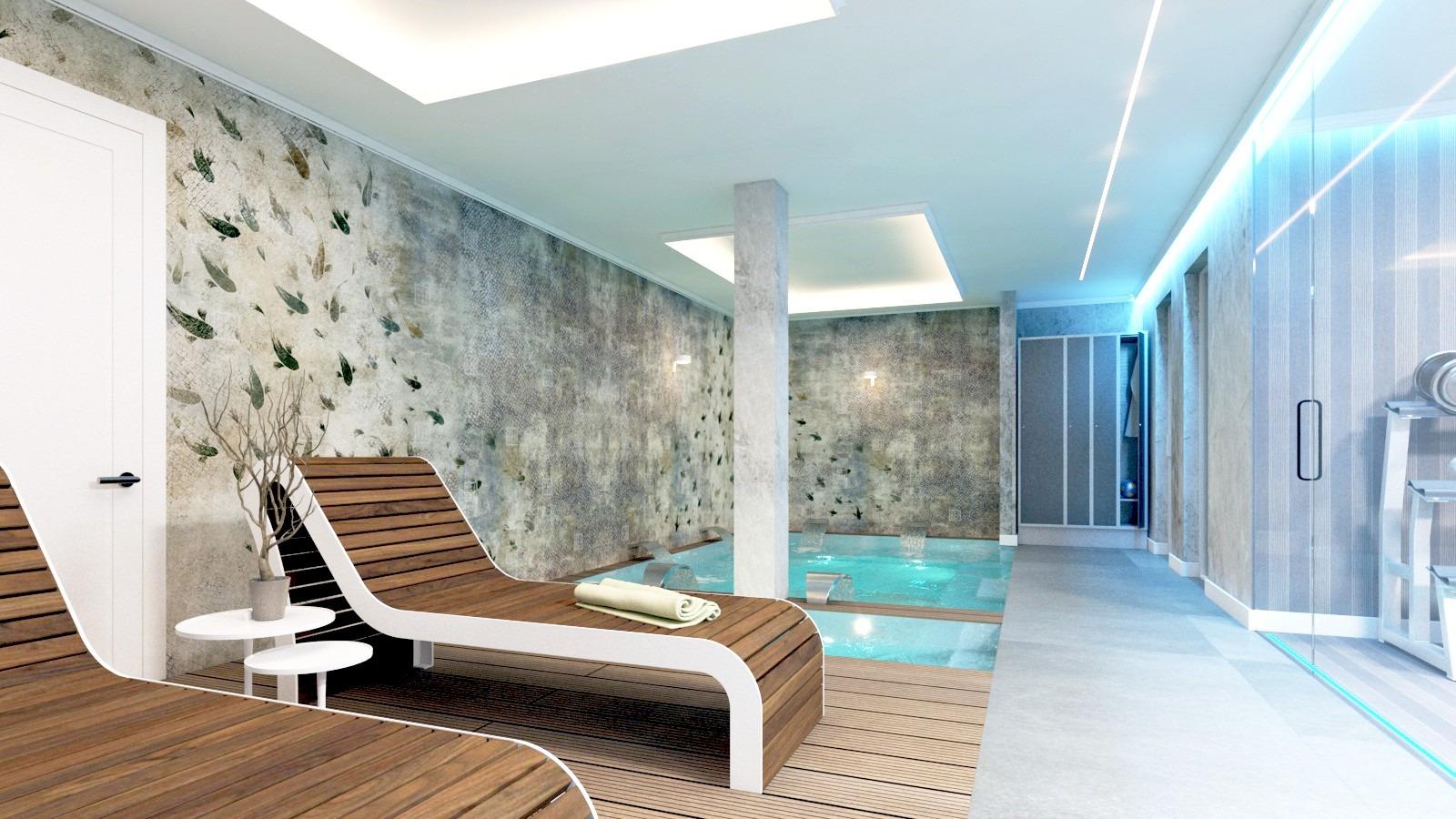Het souterrain is gewijd aan wellness en functionaliteit, met een eigen spa met jacuzzi, sauna en Turks bad, fitnessruimte, wasruimte, badkamer bij het zwembad, bijkeuken en een berging met een extra badkamer die kan dienen als gastenslaapkamer.
