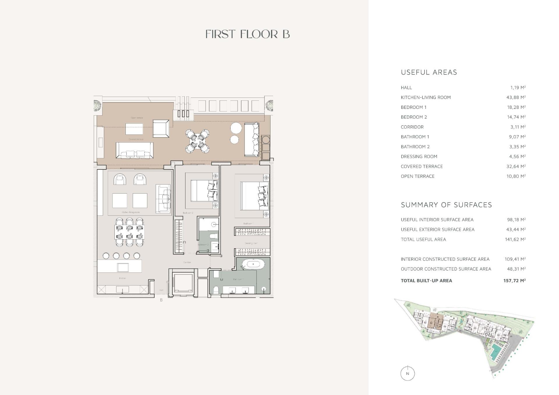 Moderne appartementen en penthousesDe gemeenschap beschikt over luxe appartementen met 2 en 3 slaapkamers, penthouses en duplex-penthouses binnen een beveiligd gated complex. De eerste fase bestaat uit slechts 16 woningen, verdeeld over twee laagbouwgebouwen, wat exclusiviteit en rust garandeert.Appartementen op de begane grond met eigen aanpasbare tuinenAppartementen op de eerste verdieping met ruime terrassenPenthouses met privézwembaden op het dak en panoramisch uitzicht