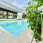 Nieuwbouw gelijkvloerse villa met 3 slaapkamers, 2 badkamers, open keuken met ruime woonkamer, inbouwkasten, terras, privétuin met het zwembad en parkeerplaats.