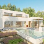 Moderne villa in aanbouw in een rustige groene omgeving van Moraira, met open uitzichten op de bergen en wijngaarden. Oplevering gepland voor juli 2025.