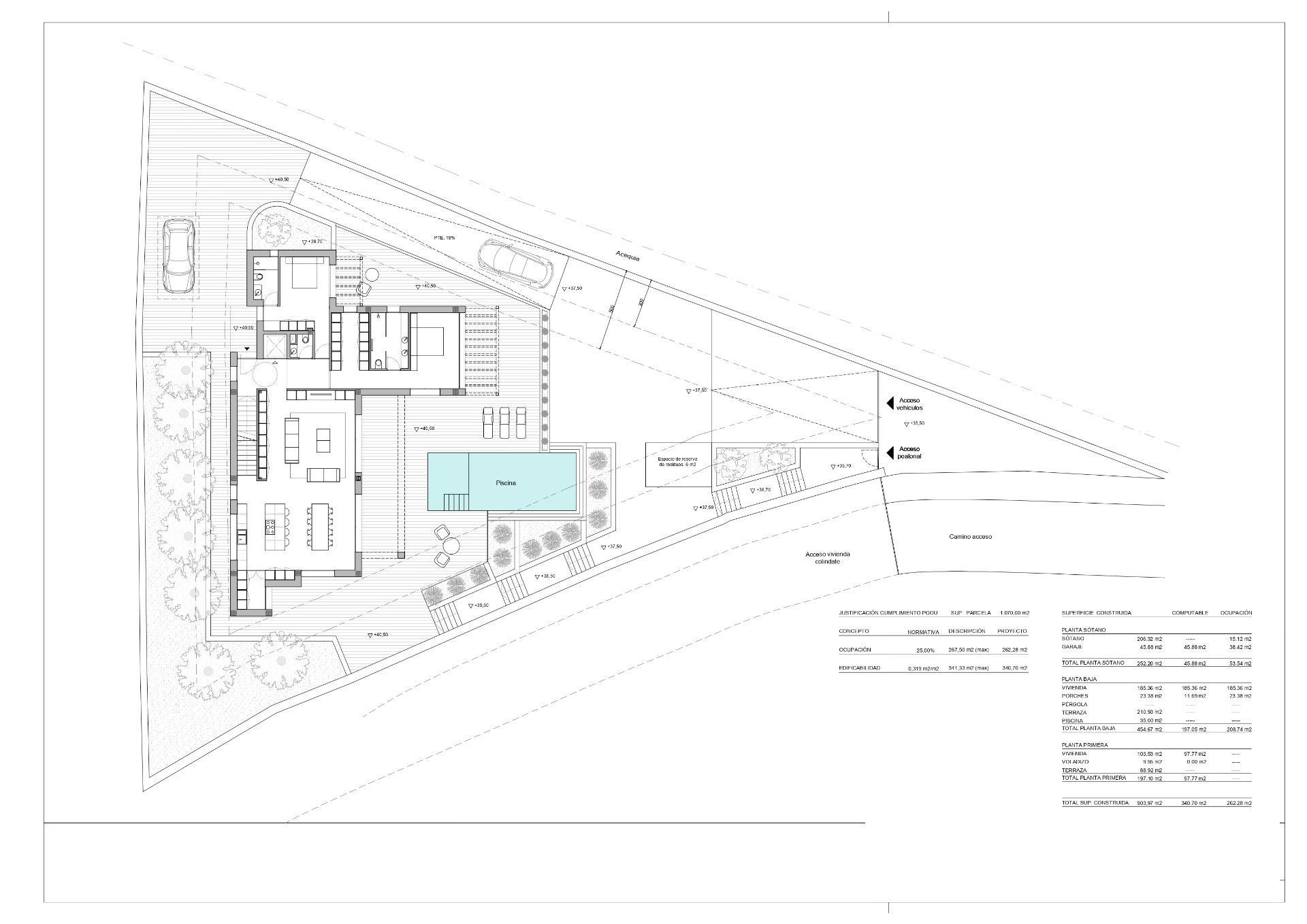 Moderne luxe villa te koop in Moraira, gelegen op slechts 600 m van het stadscentrum en 1,2 km van het El Portet-strand. Gebouwd op drie niveaus, beschikt de woning over 4 slaapkamers en 4 badkamers, inclusief een mastersuite met inloopkast en en-suite badkamer. De begane grond omvat een open-plan woon-eetkamer en keuken met directe toegang tot de tuin en het infinity zwembad. De eerste verdieping biedt een extra en-suite slaapkamer en een groot terras van 80 m². De kelder bevat een garage, bioscoopkamer en multifunctionele ruimte. Gelegen op een aangelegd perceel in een zeer gewilde woonwijk.