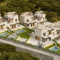 Nieuwbouw moderne herenhuizen en halfvrijstaande villa’s met verschillende terrassen en solarium, volledig omheind, met parkeerplaats voor voertuigen en privézwembad in Polop.