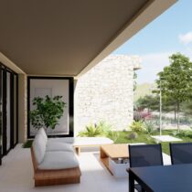 De binnenpatio in het midden van het huis vertegenwoordigt de perfecte integratie van de architectuur met de natuurlijke omgeving. Het hele huis bevat hoogwaardige materialen in de stijl van een traditionele Spaanse boerderij met een modern tintje; met nadruk op een hoge thermische en akoestische isolatie en energie-efficiëntie A, edele en natuurlijke materialen, zoals hout en natuursteen, in combinatie met stucwerk, beton en glas voor een perfecte integratie in de natuurlijke omgeving.
